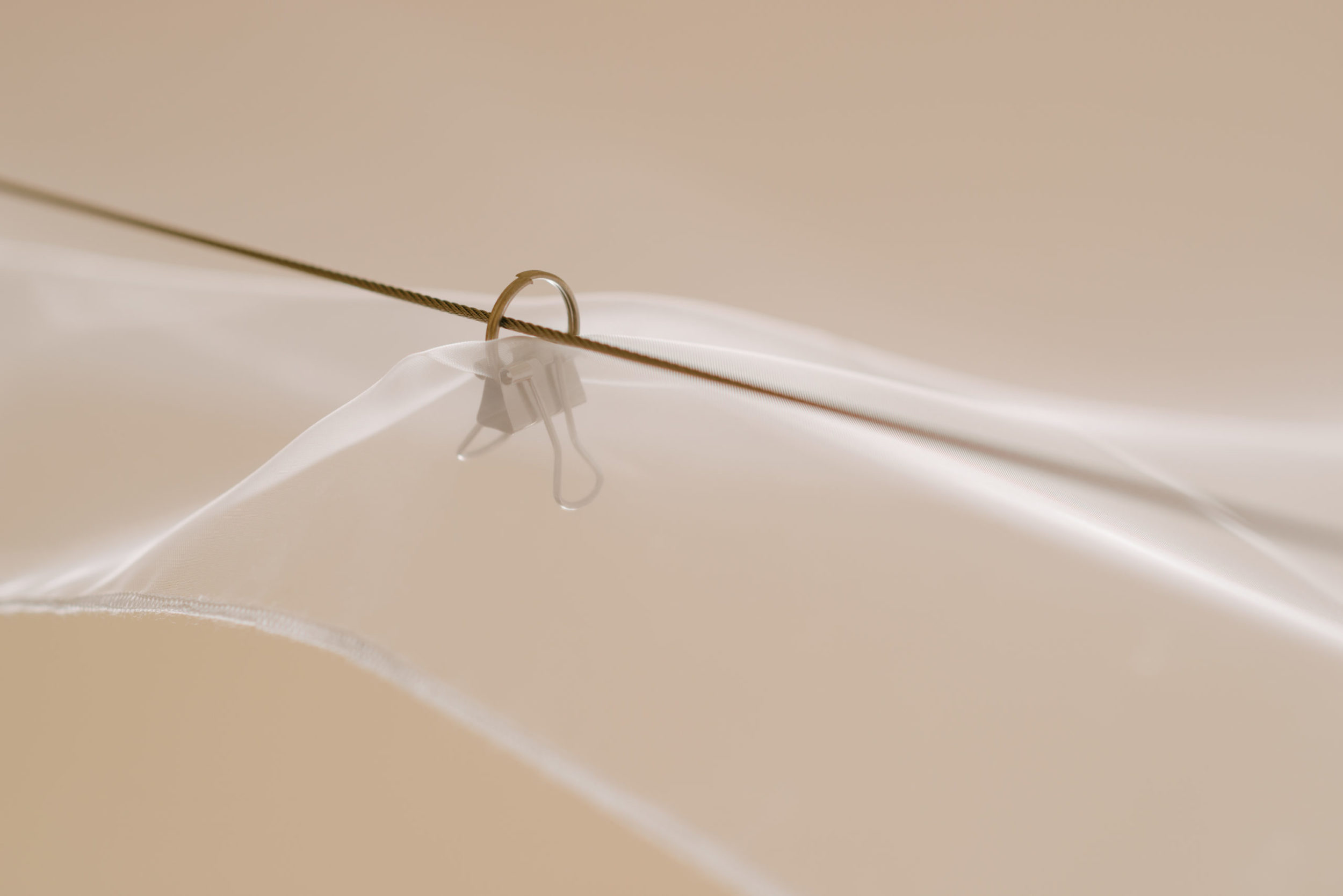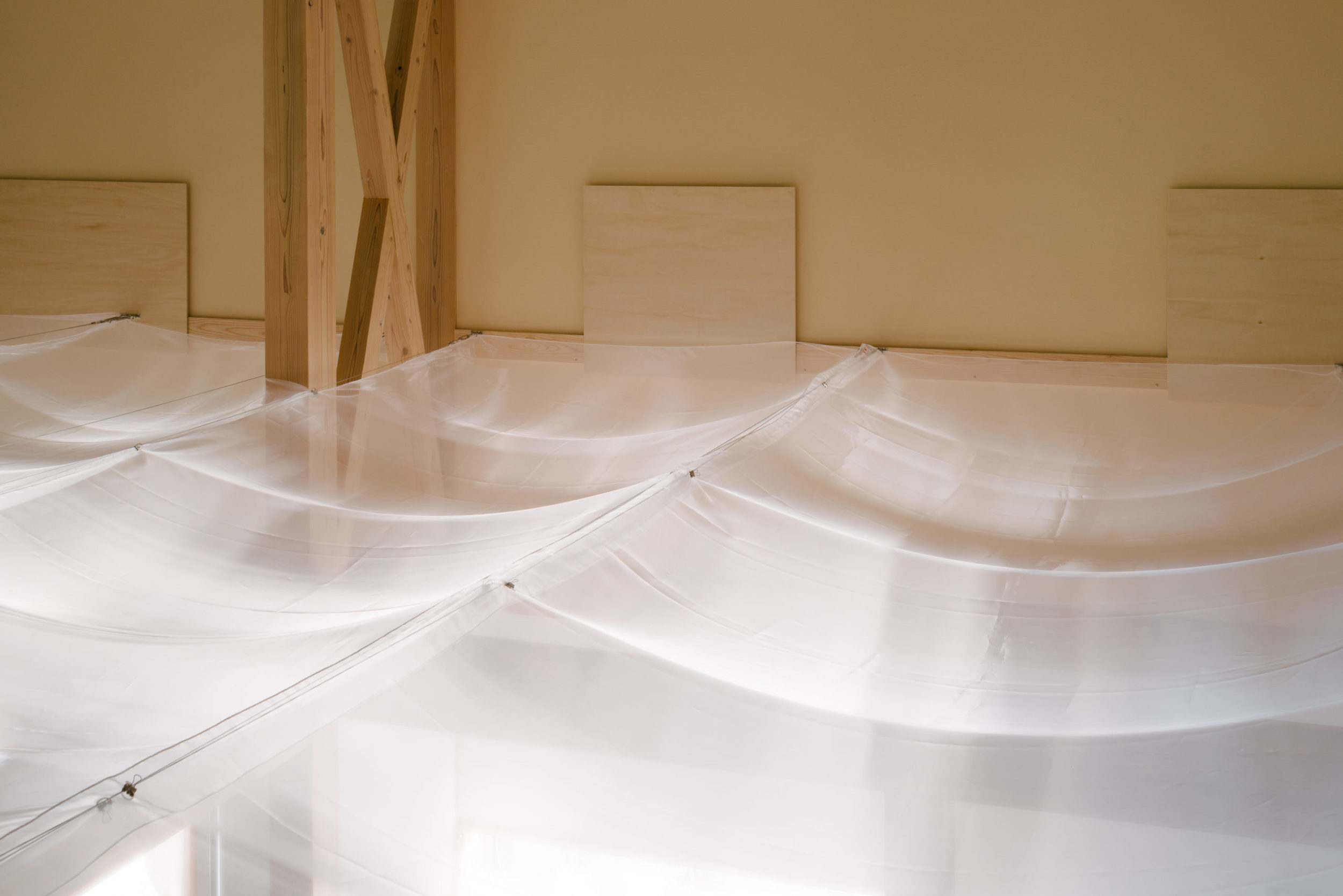 2階の手摺高さでワイヤーを張り、文房具のダブルリングとダブルクリップを用いて、端部をロックしただけの布を留めた。