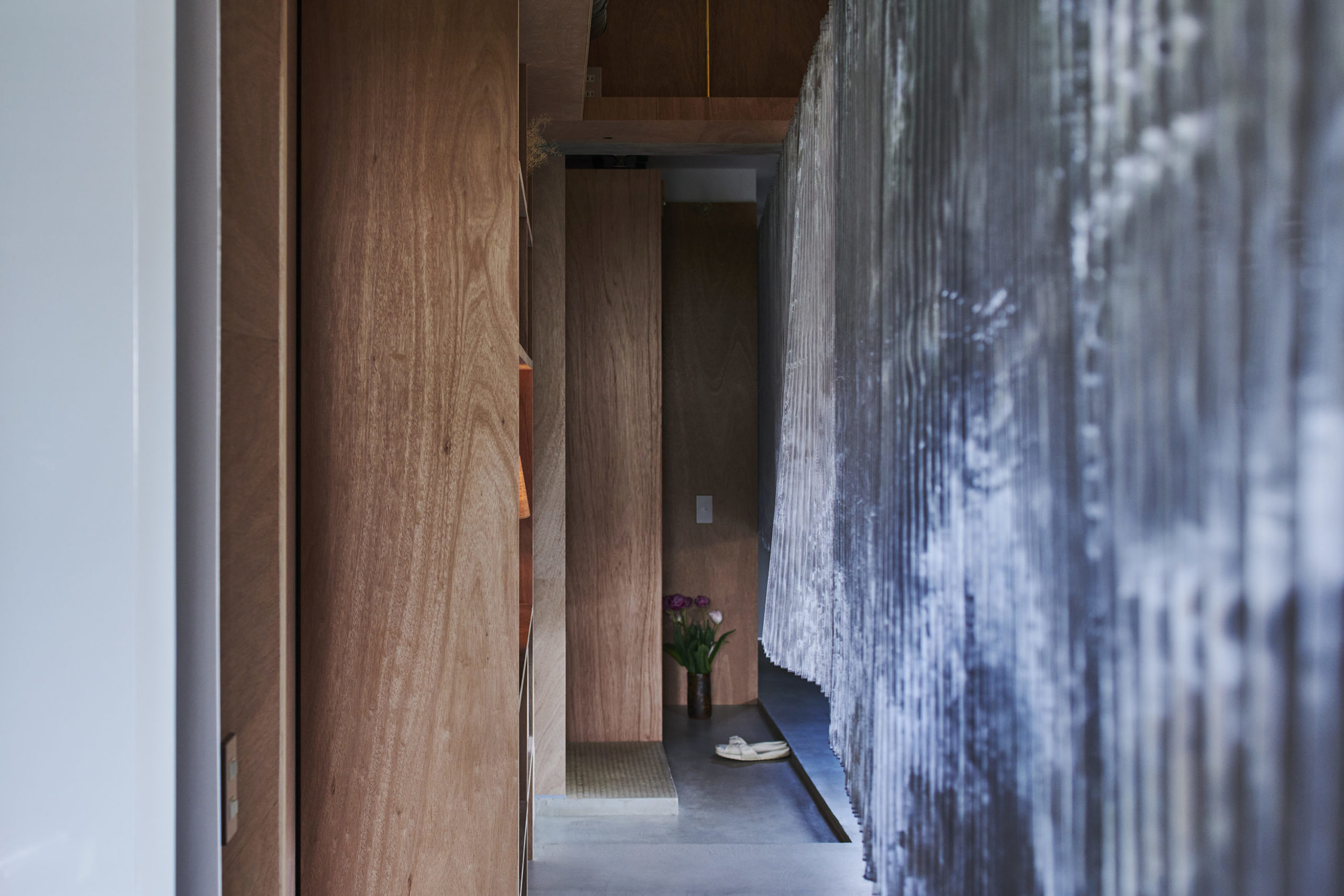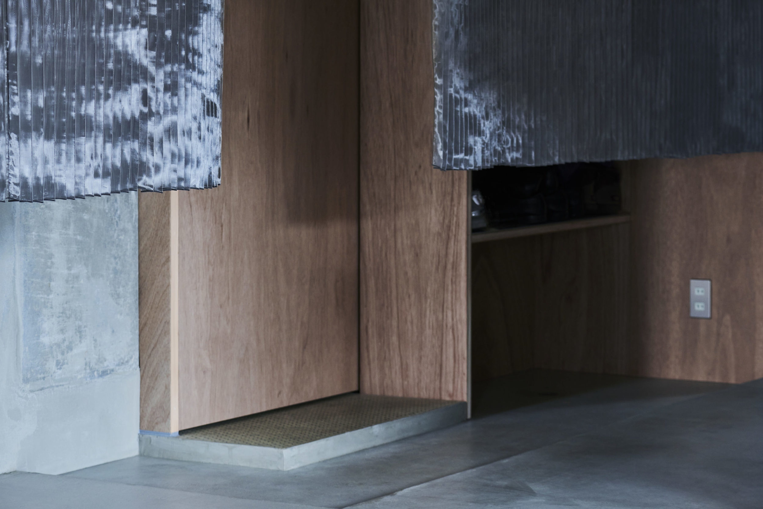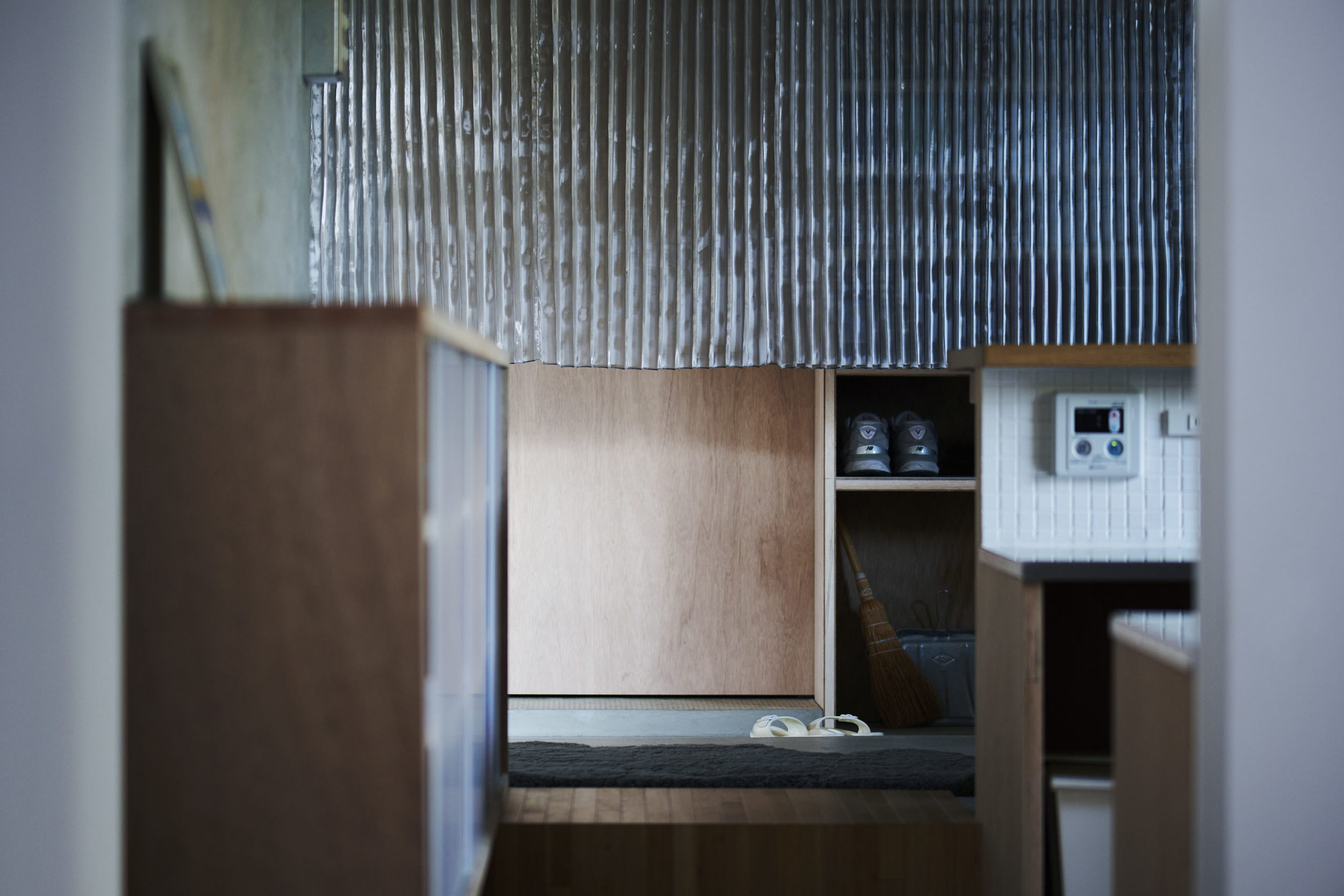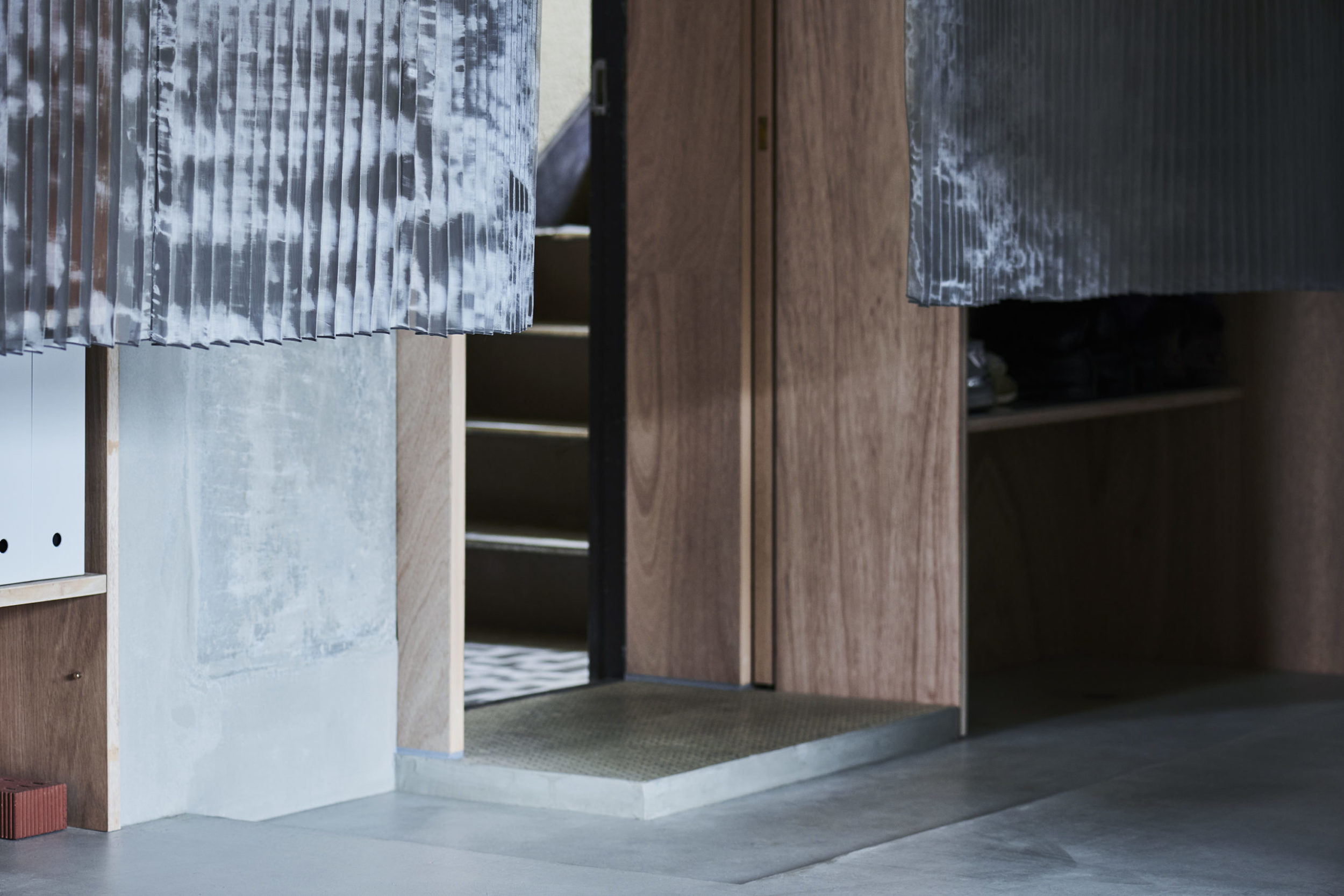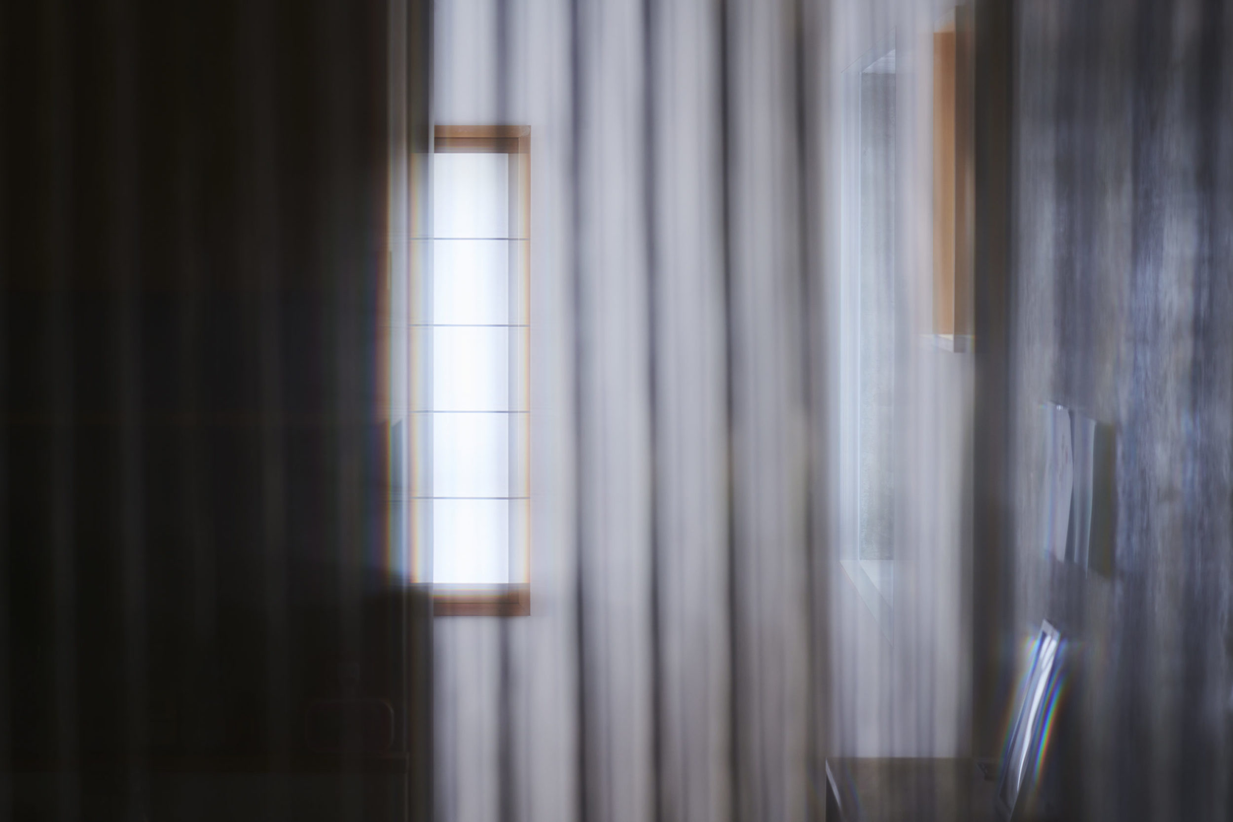 平面配置的には収納前、玄関、リビング扱いとなる室、洗面、と各室を横断するような配置とし、カーテンは3つに分割した。カーテンと記したが、立面ではキッチンの天板高さに丈を合わせており、高さ関係で言えば暖簾的な設えである。また、階高が一段下がった位置となるキッチン側から暖簾を見ると、民家の床の間にある掛け軸のような寸法にも見える。