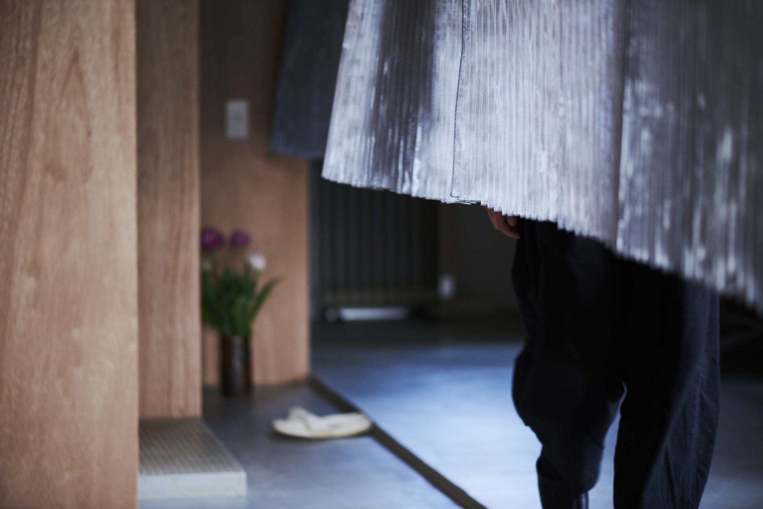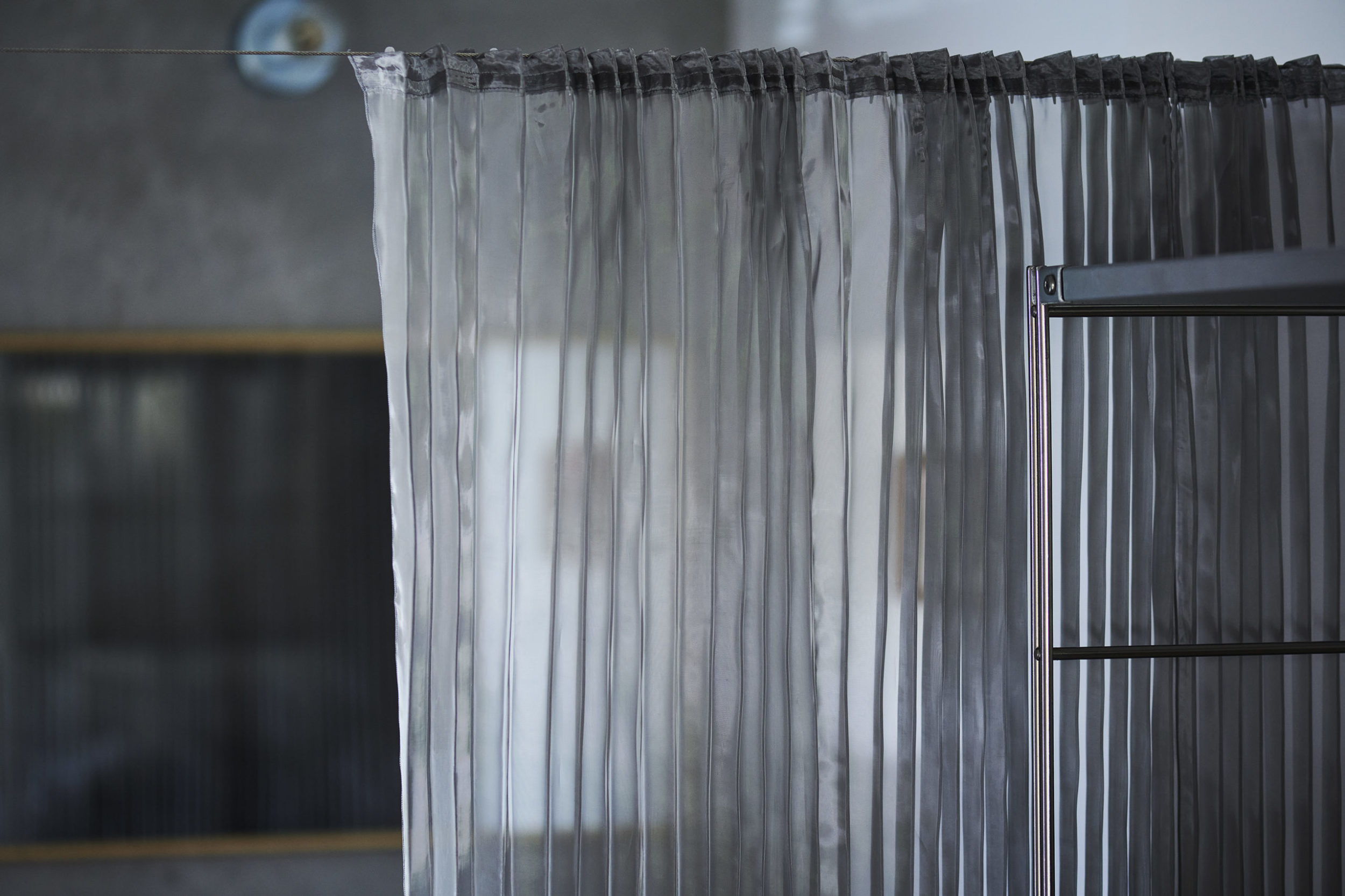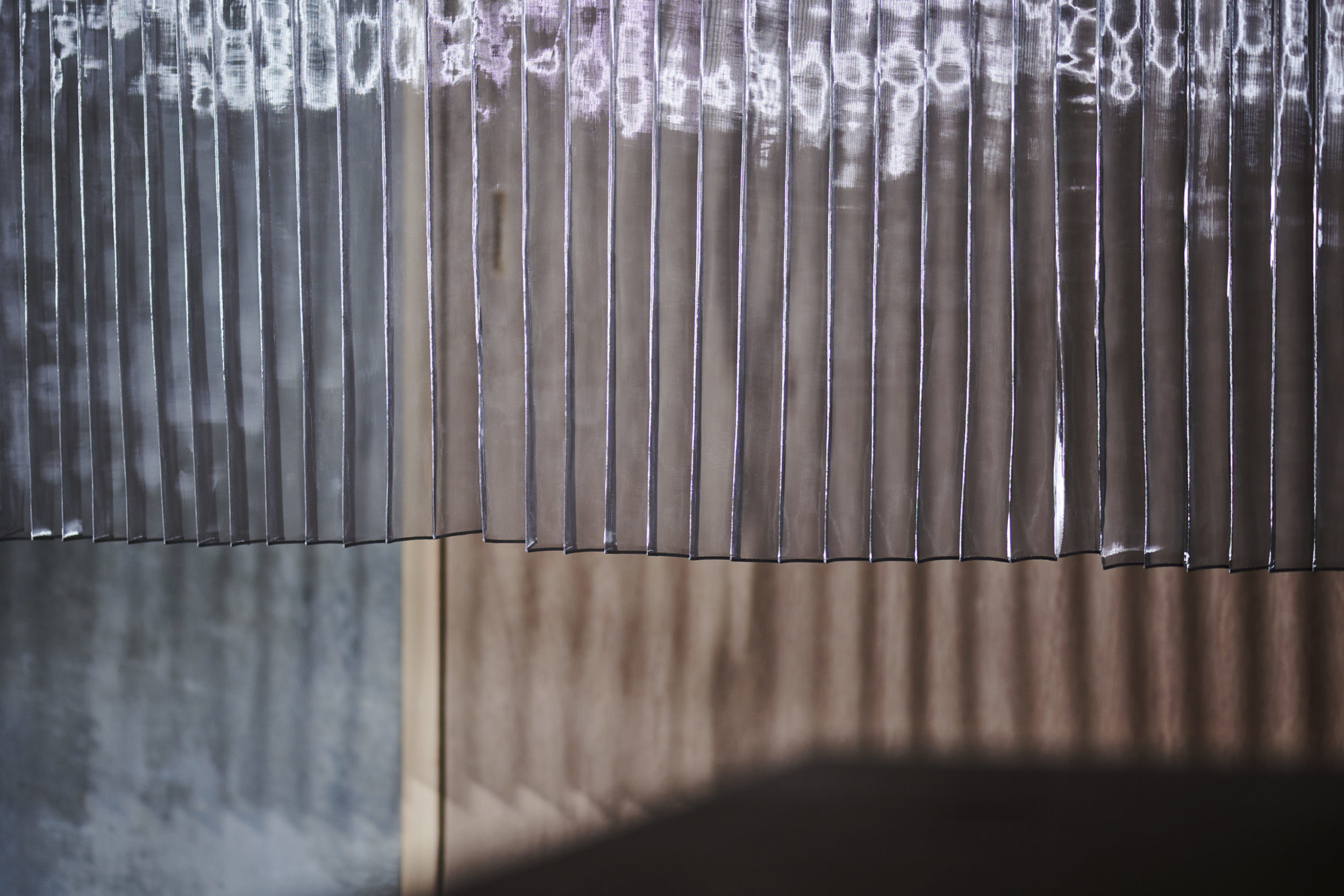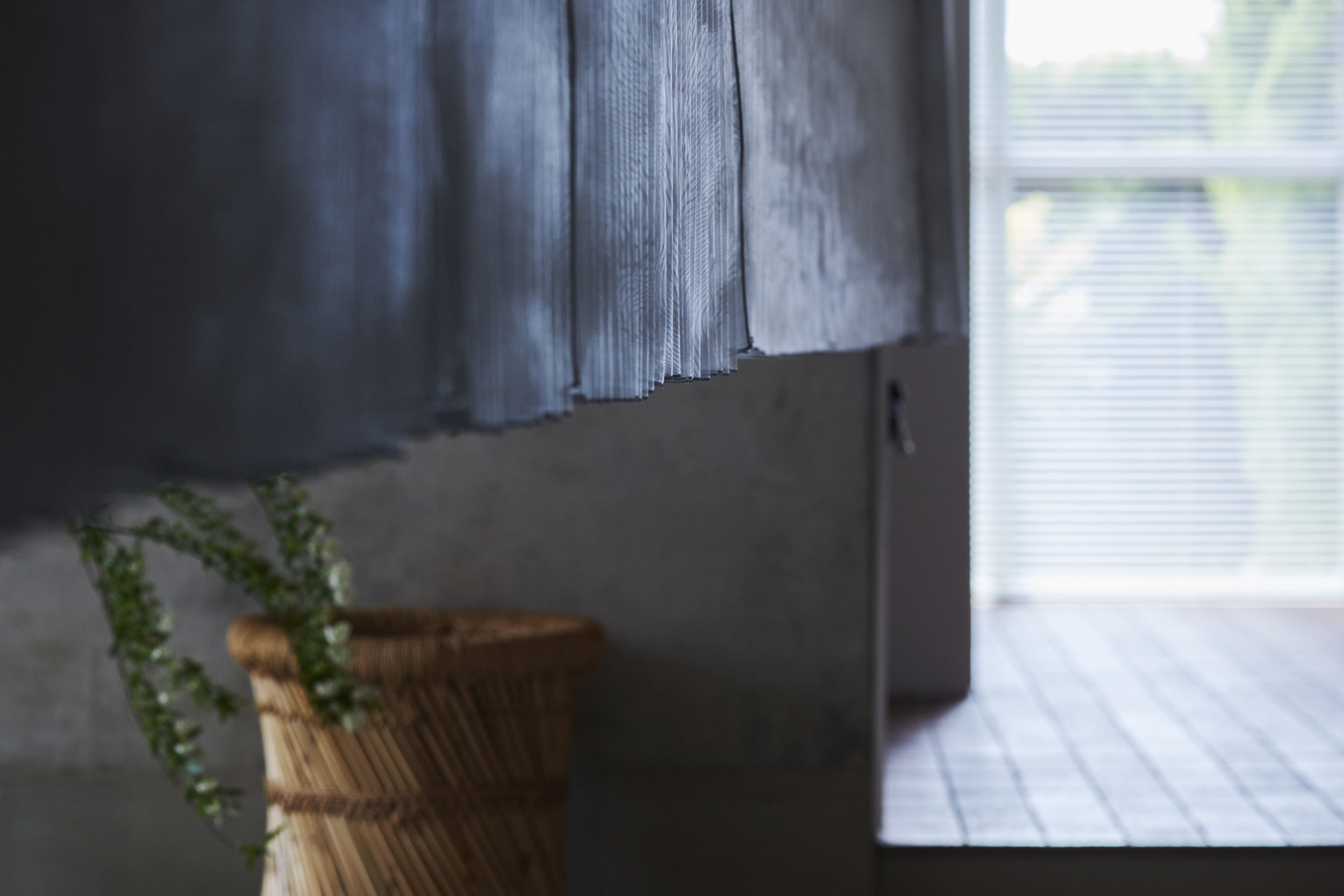 平面配置的には収納前、玄関、リビング扱いとなる室、洗面、と各室を横断するような配置とし、カーテンは3つに分割した。カーテンと記したが、立面ではキッチンの天板高さに丈を合わせており、高さ関係で言えば暖簾的な設えである。また、階高が一段下がった位置となるキッチン側から暖簾を見ると、民家の床の間にある掛け軸のような寸法にも見える。