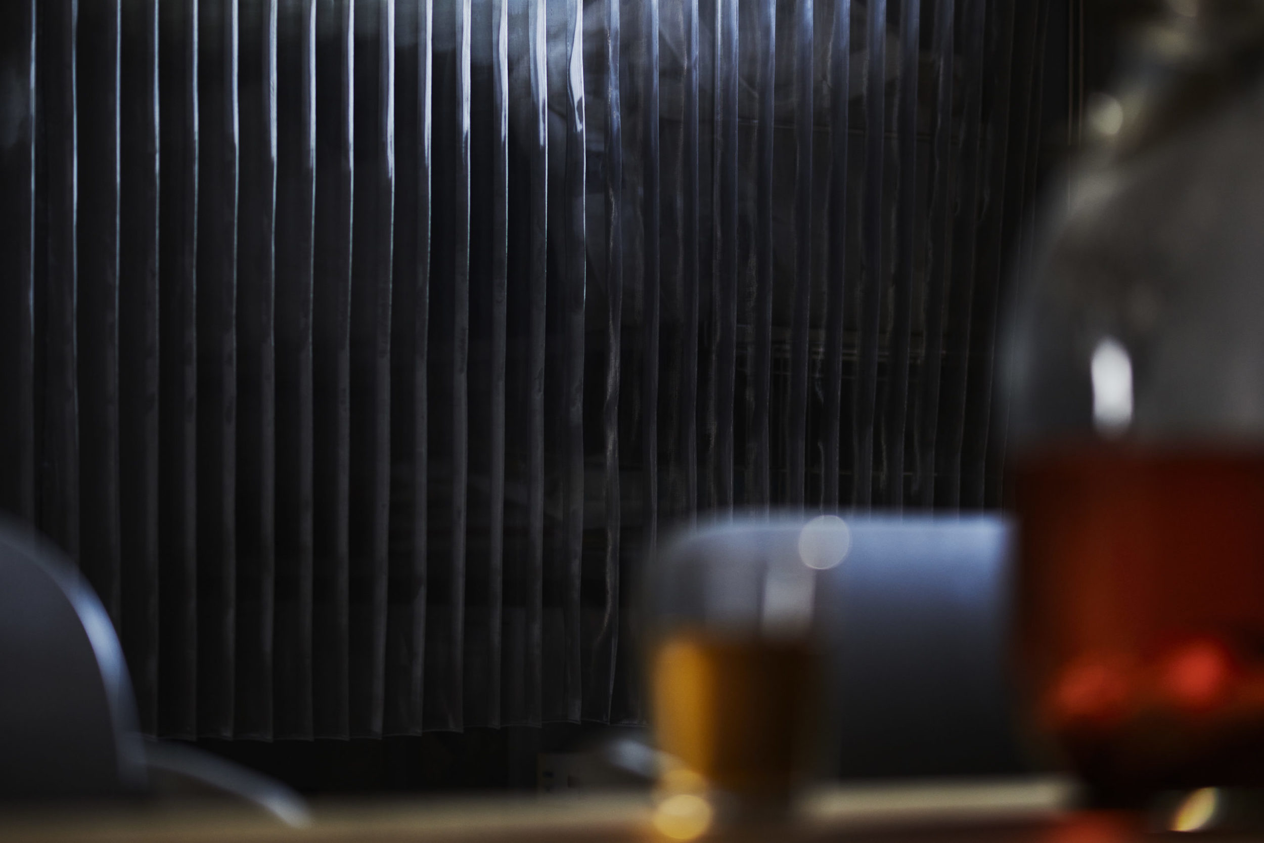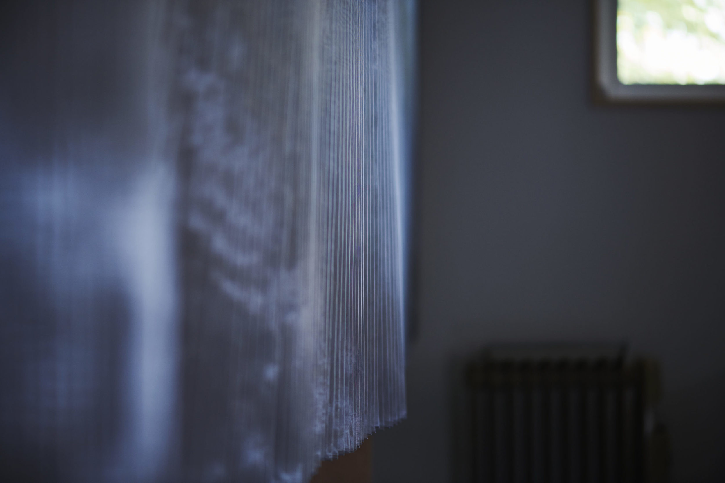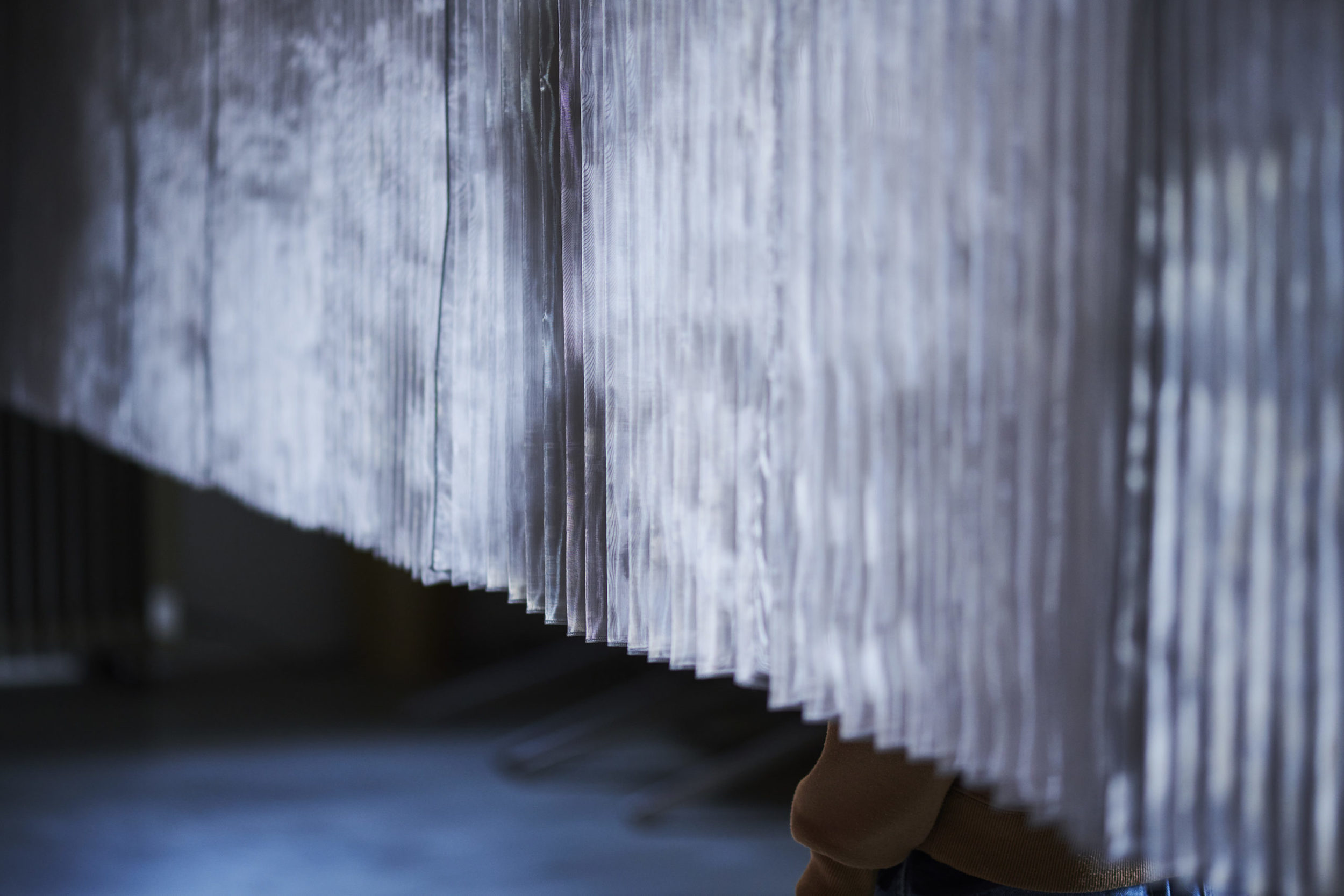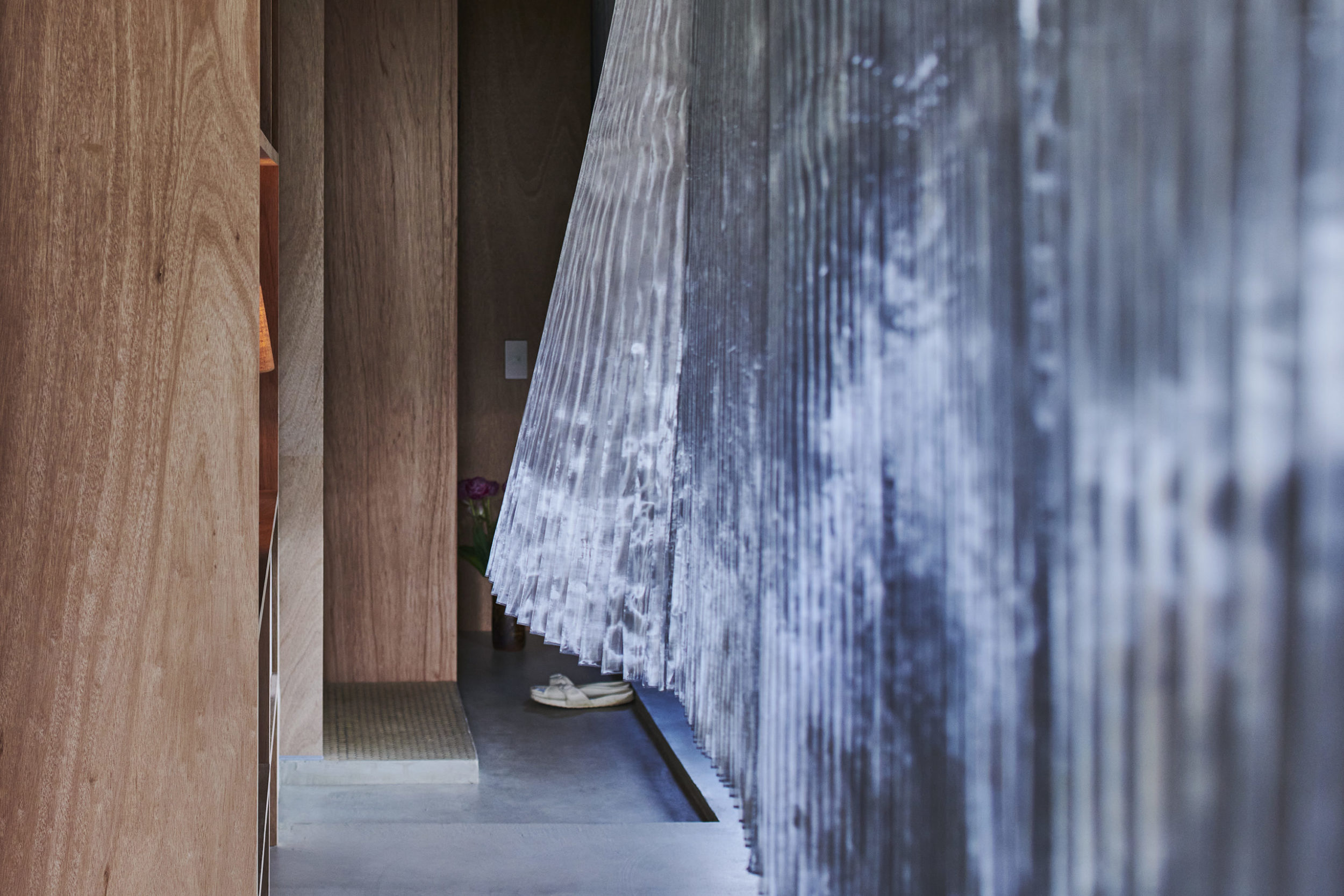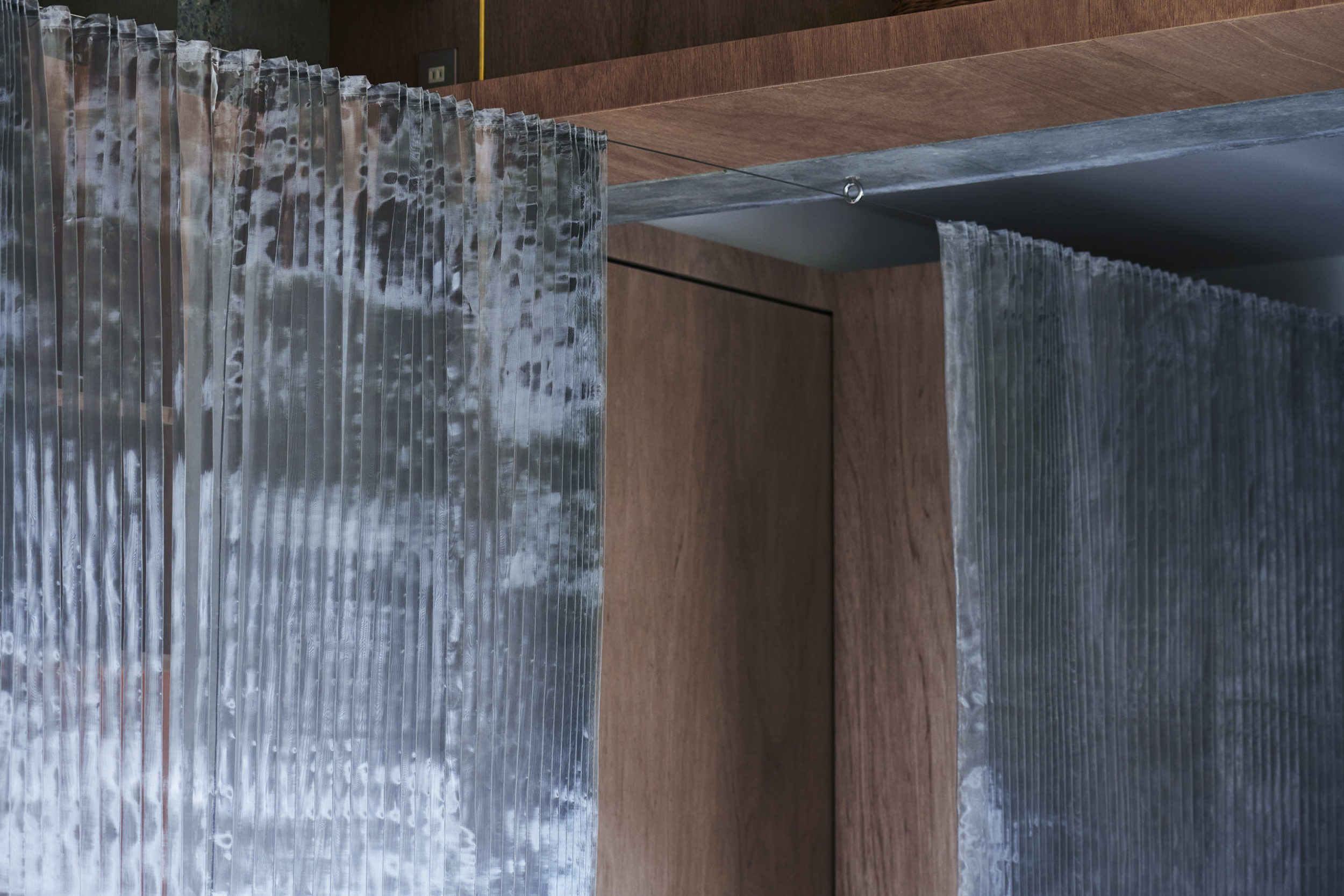 平面配置的には収納前、玄関、リビング扱いとなる室、洗面、と各室を横断するような配置とし、カーテンは3つに分割した。カーテンと記したが、立面ではキッチンの天板高さに丈を合わせており、高さ関係で言えば暖簾的な設えである。また、階高が一段下がった位置となるキッチン側から暖簾を見ると、民家の床の間にある掛け軸のような寸法にも見える。