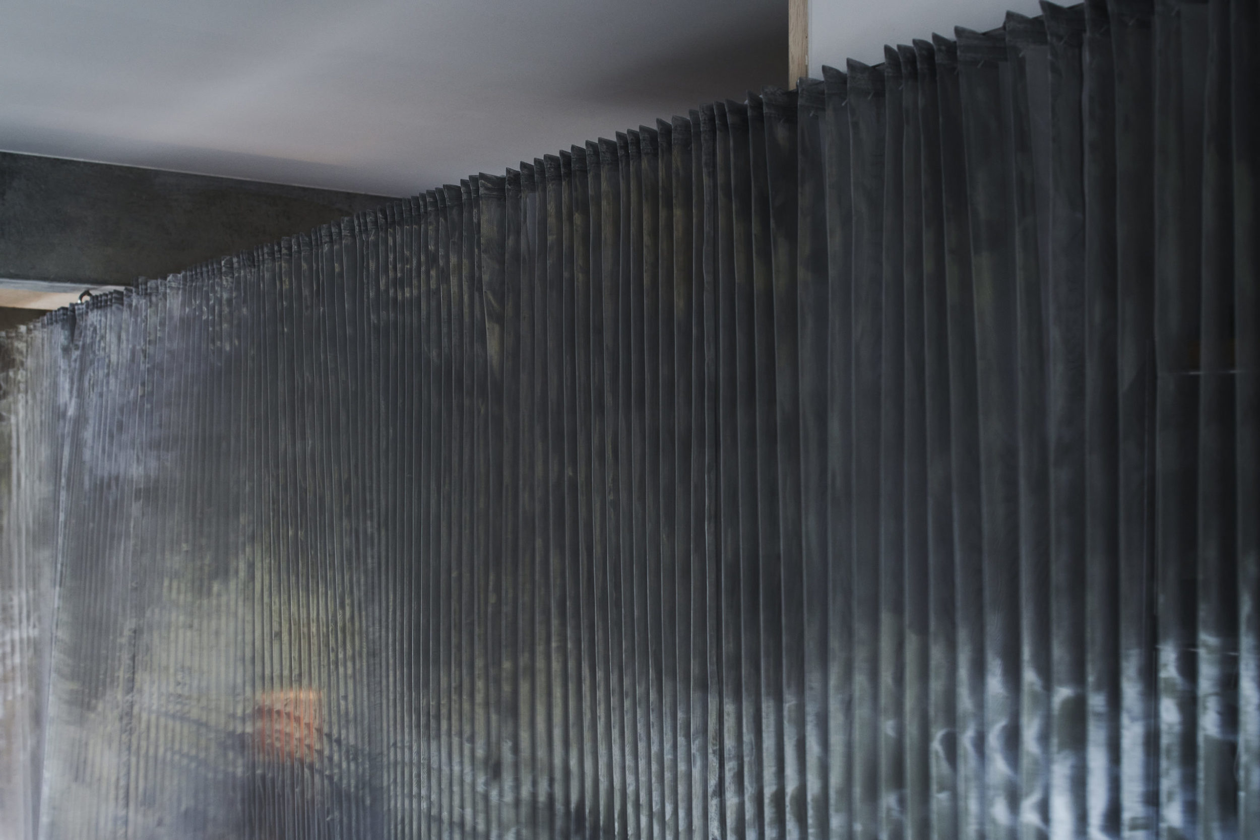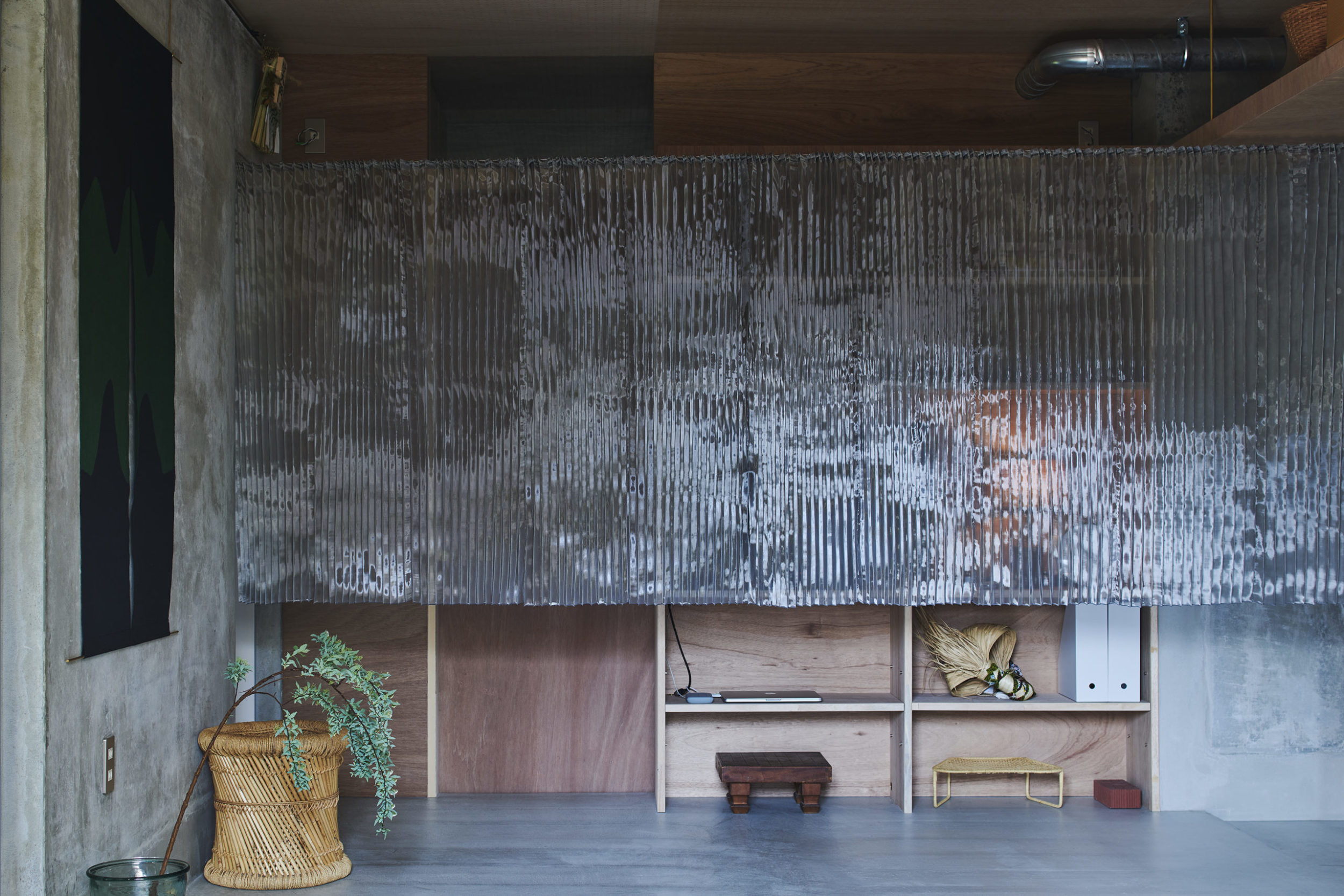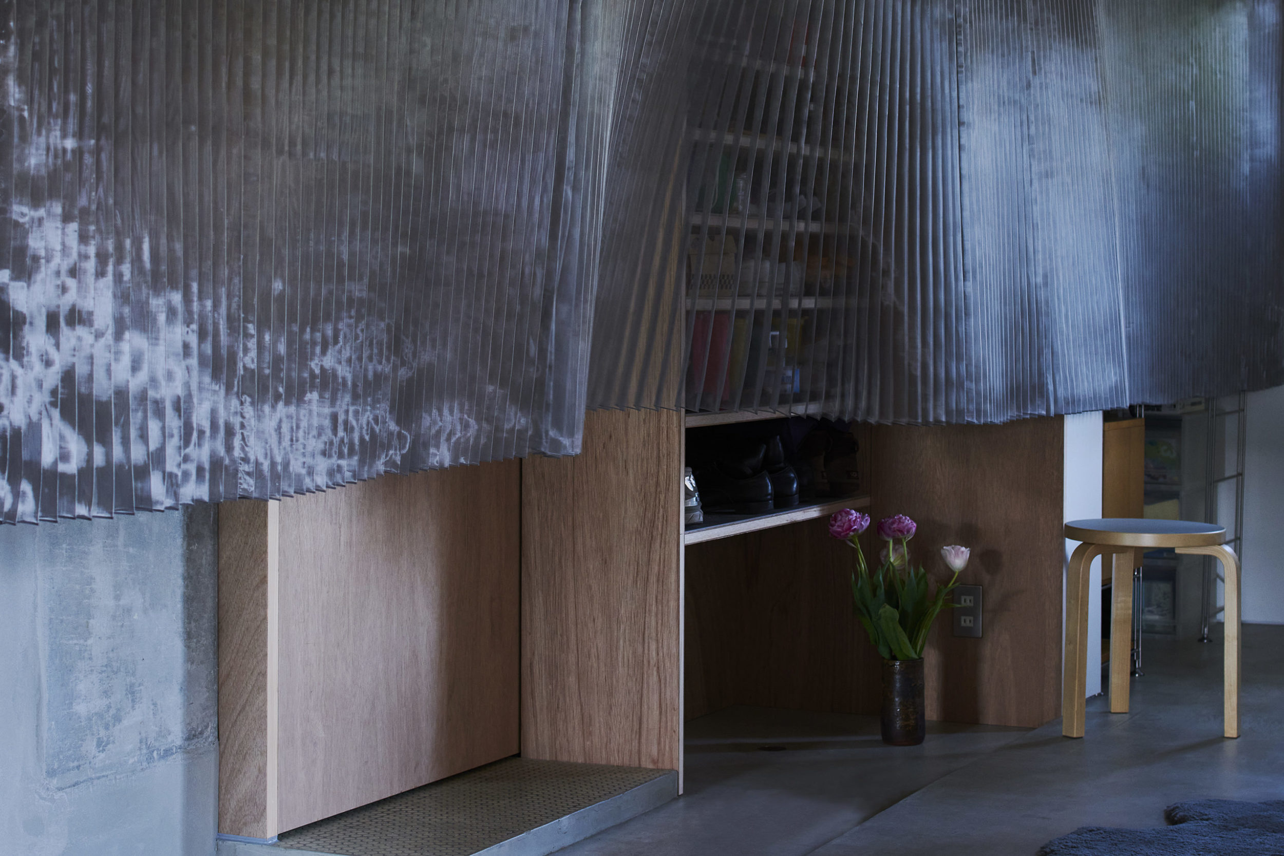 プロポーションは別宅民家周辺の石積み塀や林の密度とシンクロさせて、細かな蛇腹状とした。そして用途的には、住戸内へ入室する際の玄関網戸のようであり、リビング側から見ると背景幕のような密度感となっている。