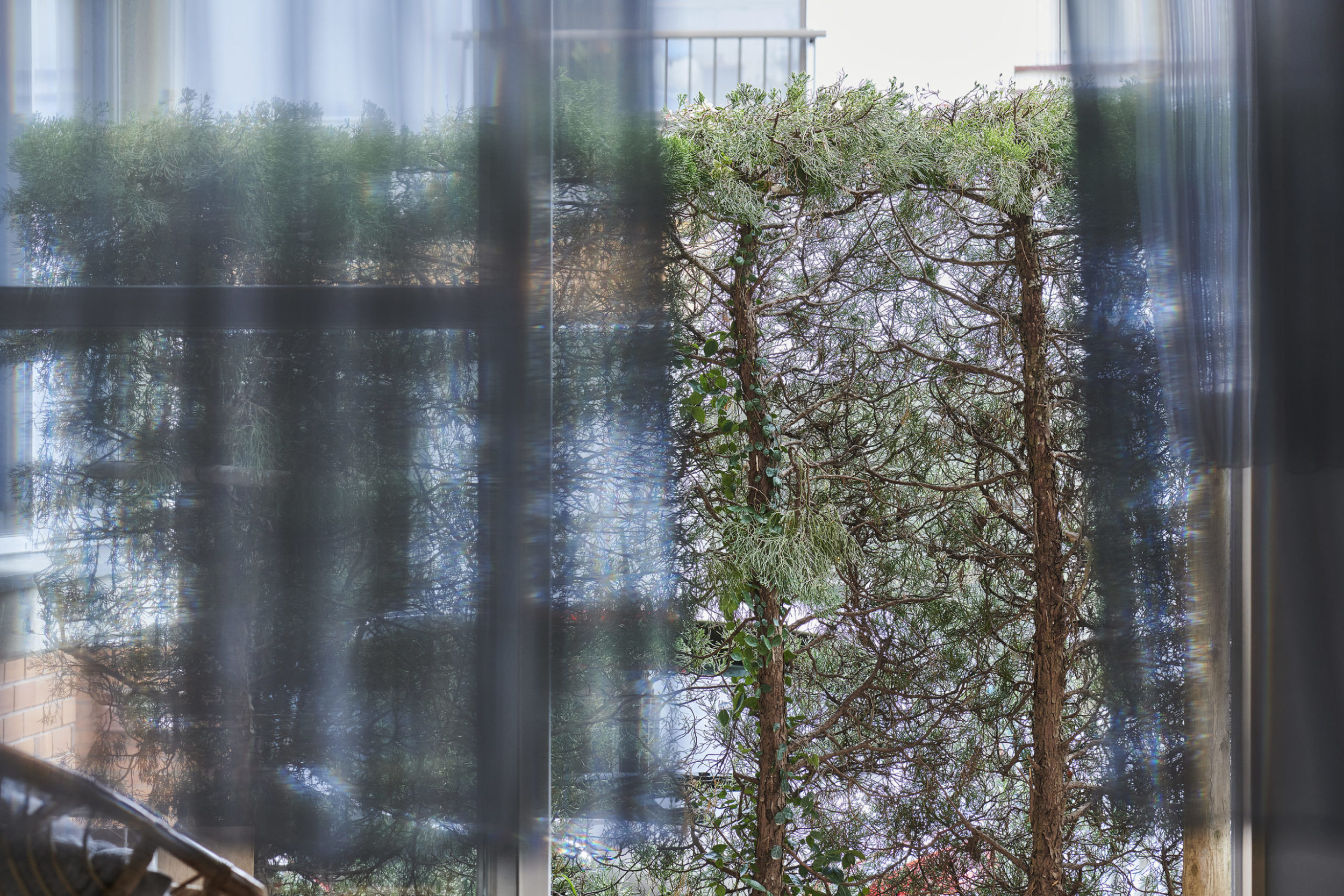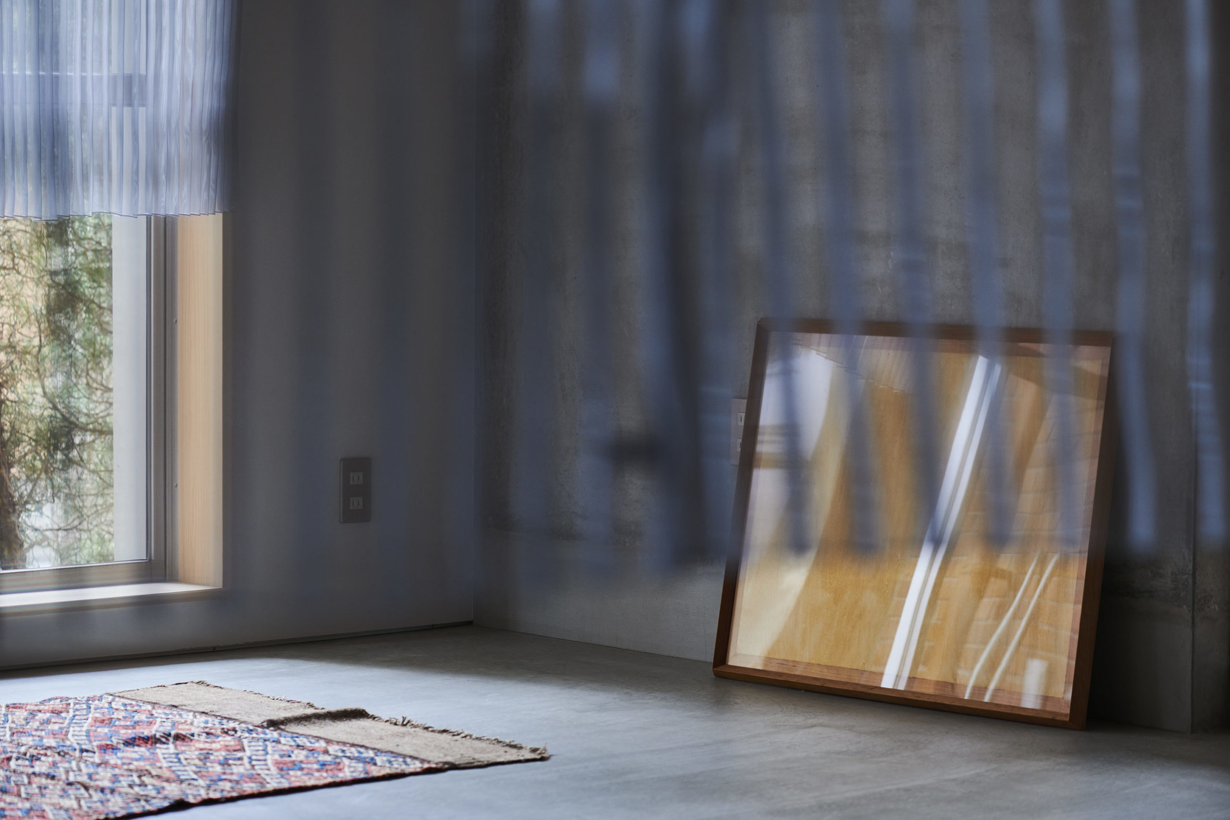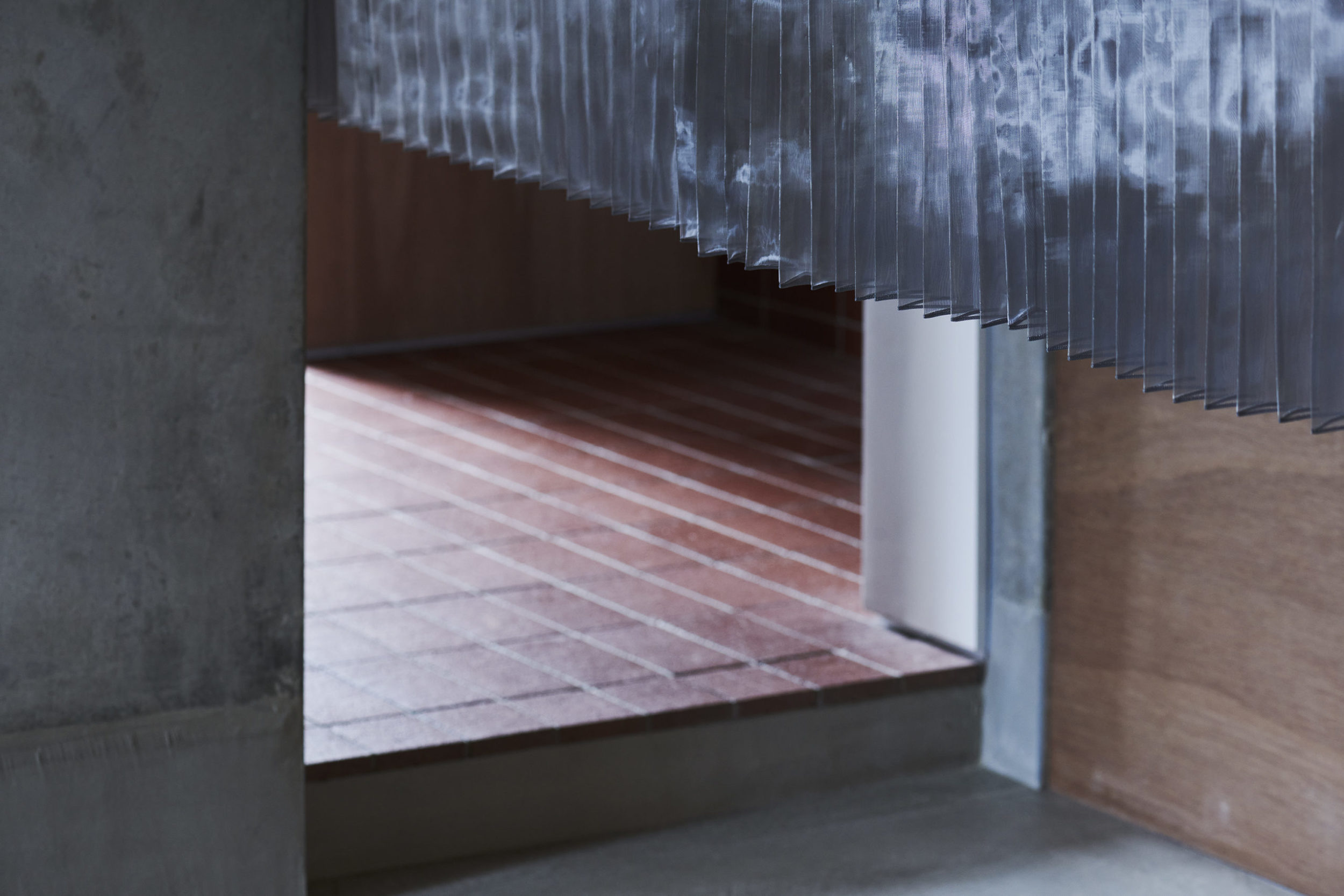 プロポーションは別宅民家周辺の石積み塀や林の密度とシンクロさせて、細かな蛇腹状とした。そして用途的には、住戸内へ入室する際の玄関網戸のようであり、リビング側から見ると背景幕のような密度感となっている。