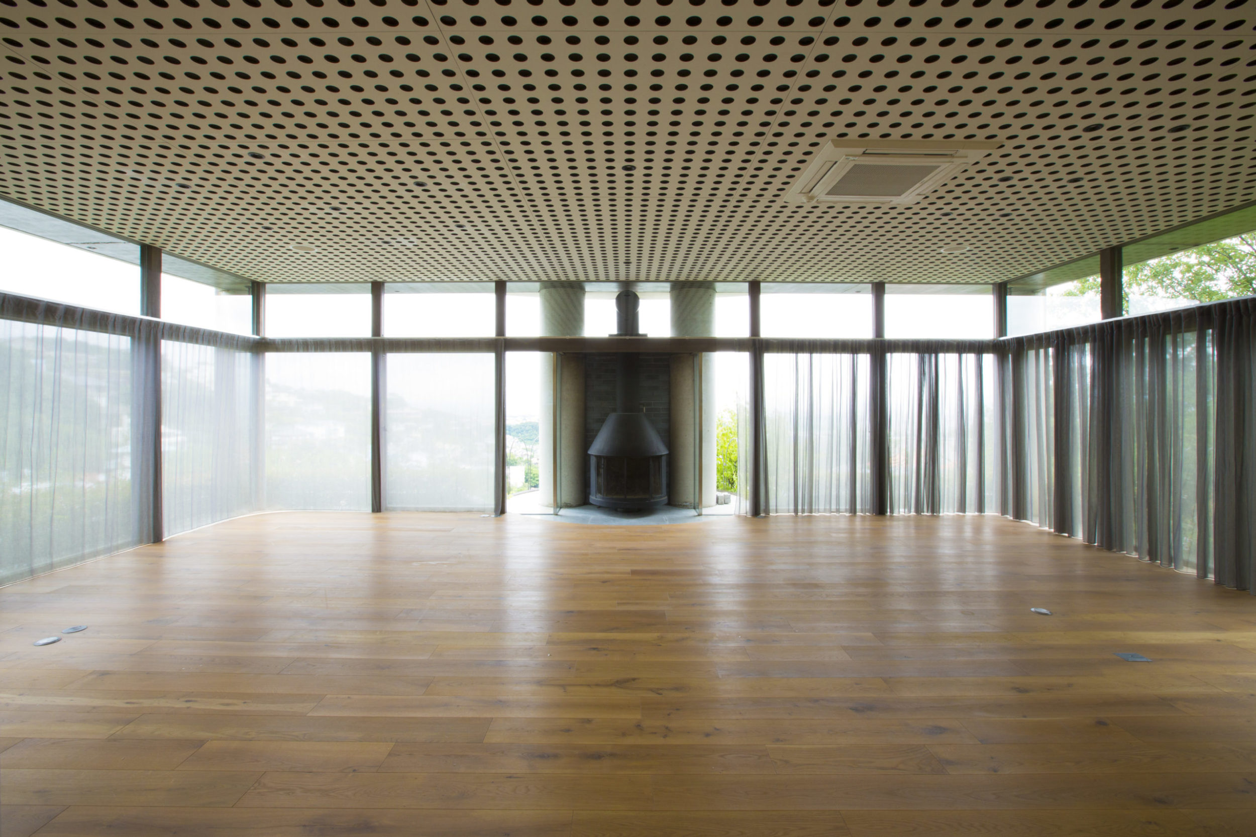 眺望を担保したい室は、隣地からの視線を遮るために必要最低限な量の布を用意し、コの字型のカーテンレール内で粗密を調整できるようにした。